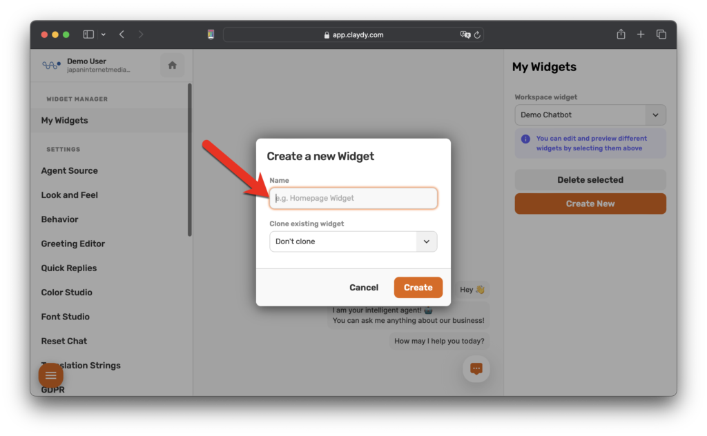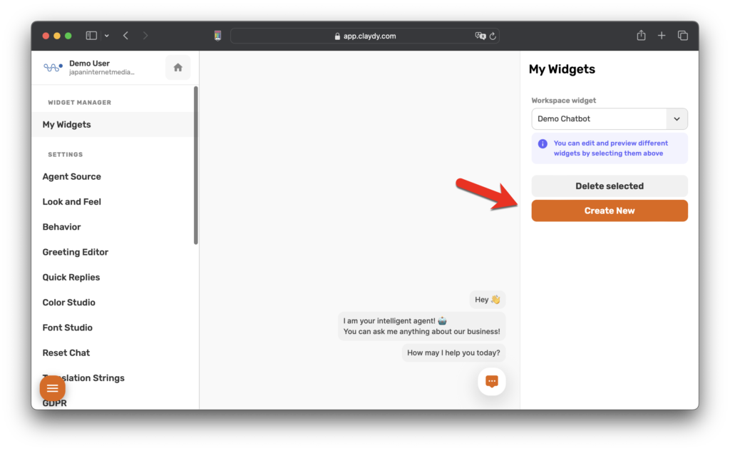 يمكنك الوصول إلى مدير Chatbot داخل لوحة معلومات CLAYDY أو بالنقر فوق هذا رابط . انطلق في رحلتك من خلال إنشاء أول روبوت محادثة بالذكاء الاصطناعي. ما عليك سوى النقر فوق "إنشاء جديد" للبدء.
