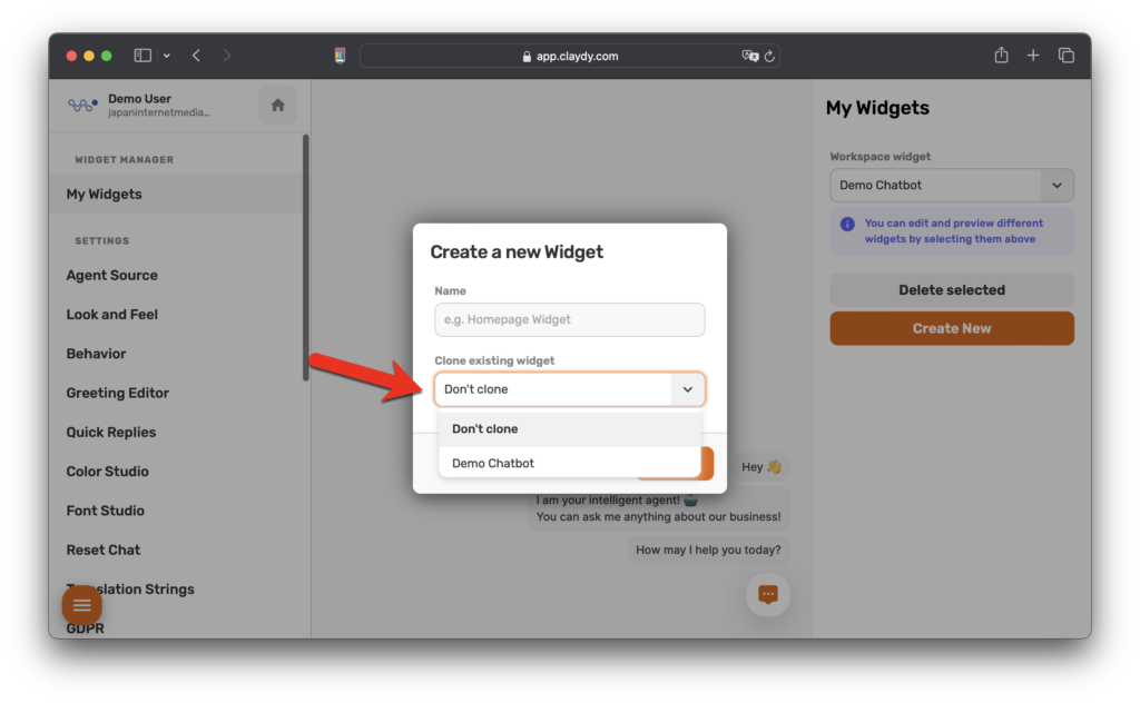ماذا لو كان لديك بالفعل روبوت محادثة بالذكاء الاصطناعي وترغب في إنشاء روبوت جديد بنفس الإعدادات؟ سؤال رائع! في CLAYDY ، يمكنك بسهولة تكرار روبوت محادثة موجود. هذه الميزة موفرة للوقت الحقيقي إذا كنت تخطط لإنشاء روبوت محادثة مشابه لتلك التي لديك بالفعل.