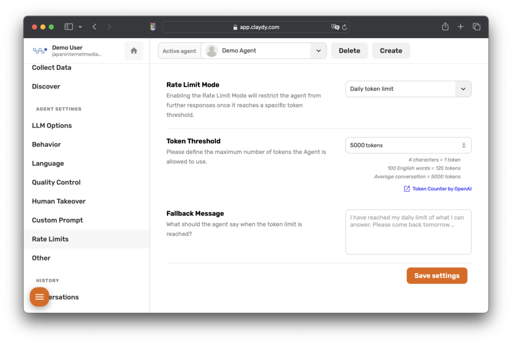 على CLAYDY ، يمكن أن يكون لكل روبوتات محادثة الذكاء الاصطناعي حدود محددة للسعر. يساعد هذا في التحكم في مقدار ما يمكن لروبوت المحادثة الخاص بك "الدردشة" كل يوم ، مما يجعله طريقة رائعة لإدارة ميزانيتك بفعالية!